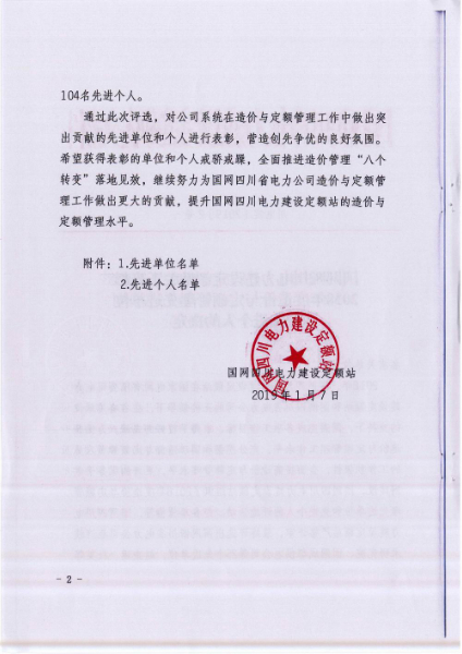 先進單位和(hé)個(gè)人(rén)——國網四川電(diàn)力建設定額站:2018年度四川電(diàn)力工程造價與定額管理(lǐ)先進單位和(hé)個(gè)人(rén)