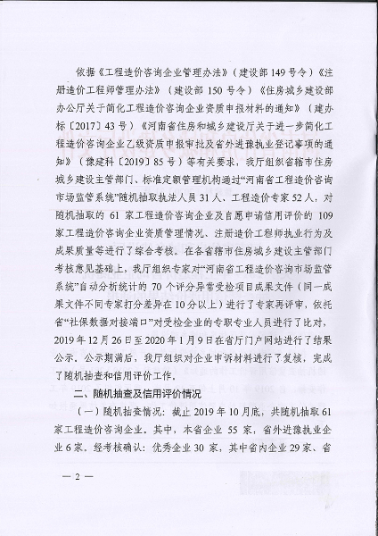 河(hé)南省住房(fáng)和(hé)城鄉建設廳2020年度工程造價企業随機抽查——優秀企業